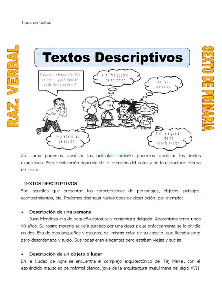 Además, hallaras muchas actividades de textos descriptivos que ayudaran a los niños de tercero de primaria en su aprendizaje. Es una técnica literaria que se utiliza cuando se quiere . En este vídeo vamos a explicar los textos descriptivos y sus características para niños de primaria, con ejemplos y ejercicios. Que corresponde al área de razonamiento verbal, para niños de 8 y 9 . Para escribir el texto descriptivo sobre tus características físicas, .